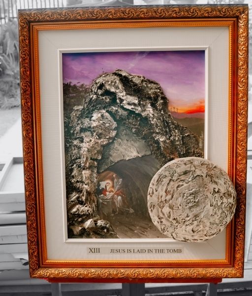 Nyra Portiles, a member of the Evangelization and Missions Group, noted her appreciation for Roy Bean Paz’s interpretation of Station XIII, Jesus is Laid in the Tomb. She pointed to the artist’s use of mixed media, an unconventional blend of materials that created a textured, almost earthen depiction of the tomb. The work’s raw and tactile quality, she observed, gave it a distinct emotional weight, as though the viewer was standing before the very place of burial.