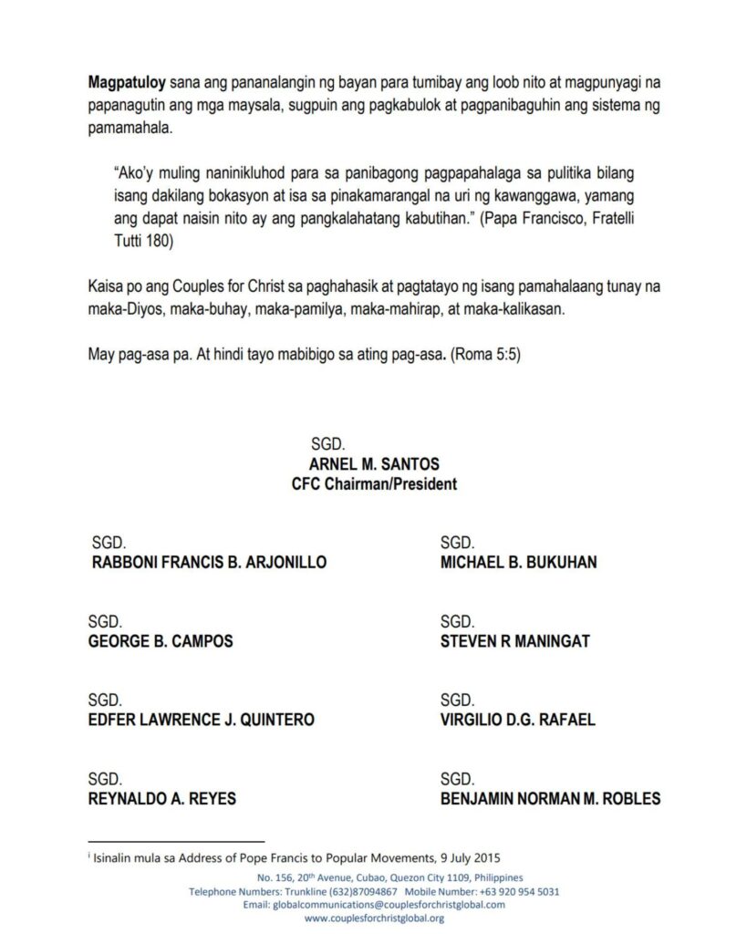 Kaisa po ang Couples for Christ sa paghahasik at pagtatayo ng isang pamahalaang tunay na maka-Diyos, maka-buhay, maka-pamilya, maka-mahirap, at maka-kalikasan.